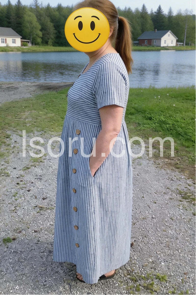 Summer clothing has always been a struggle for me. More so now since moving to a place where summer seems to last half the year and reach over 100F before midday. Shorts are unflattering on me. T shirts are either too boxy, too clingy, or too long. Summer dresses are often too short for comfort on a windy day and sleeveless and I don't want my arms bare every day. This dress checks all the boxes for a functional, EASY summer essential. The fabric is breathable, the buttons don't gape and not elastic which makes for a comfortable, non-constricting fit. It's a plain dress on its own, but can be styled down with white sneakers or sandals or up with accessories and strapy heals. I've purchased in blue stripe, I could wear them every day. I might even double up on some of these. I'd say it runs a little big, so if you're between sizes size down. They hold up well in the washer but I recommend hanging to dry. I'm so relieved heading in to this summer prepared and could not recommend this dress enough.