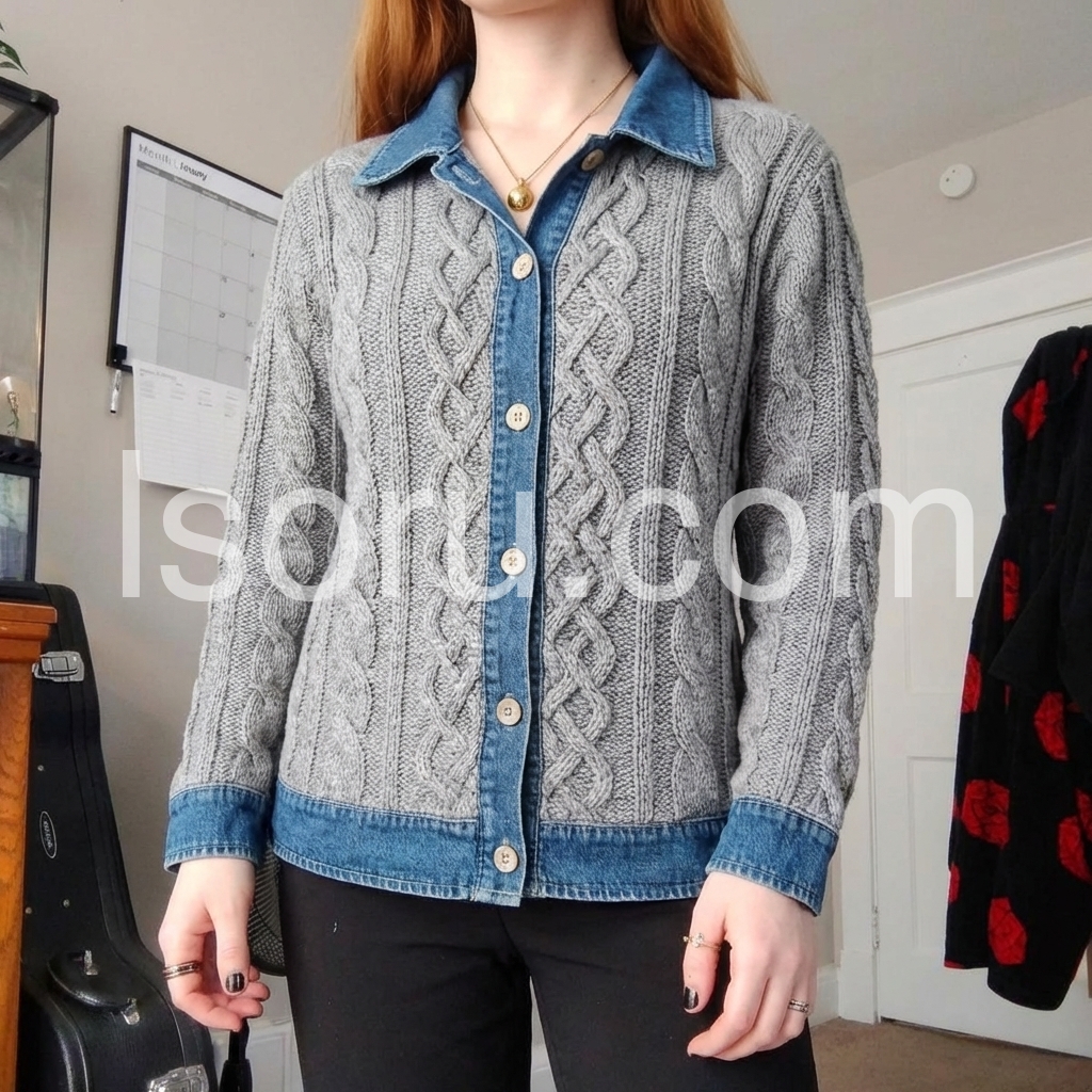 This top is such a great blend of comfy and fashionable. The light gray knit is soft-looking and the braided cable pattern gives it a premium feel. I also really like how the blue denim border stands out—it's flattering and adds personality without being too loud. Overall, it’s a perfect piece for everyday outfits.