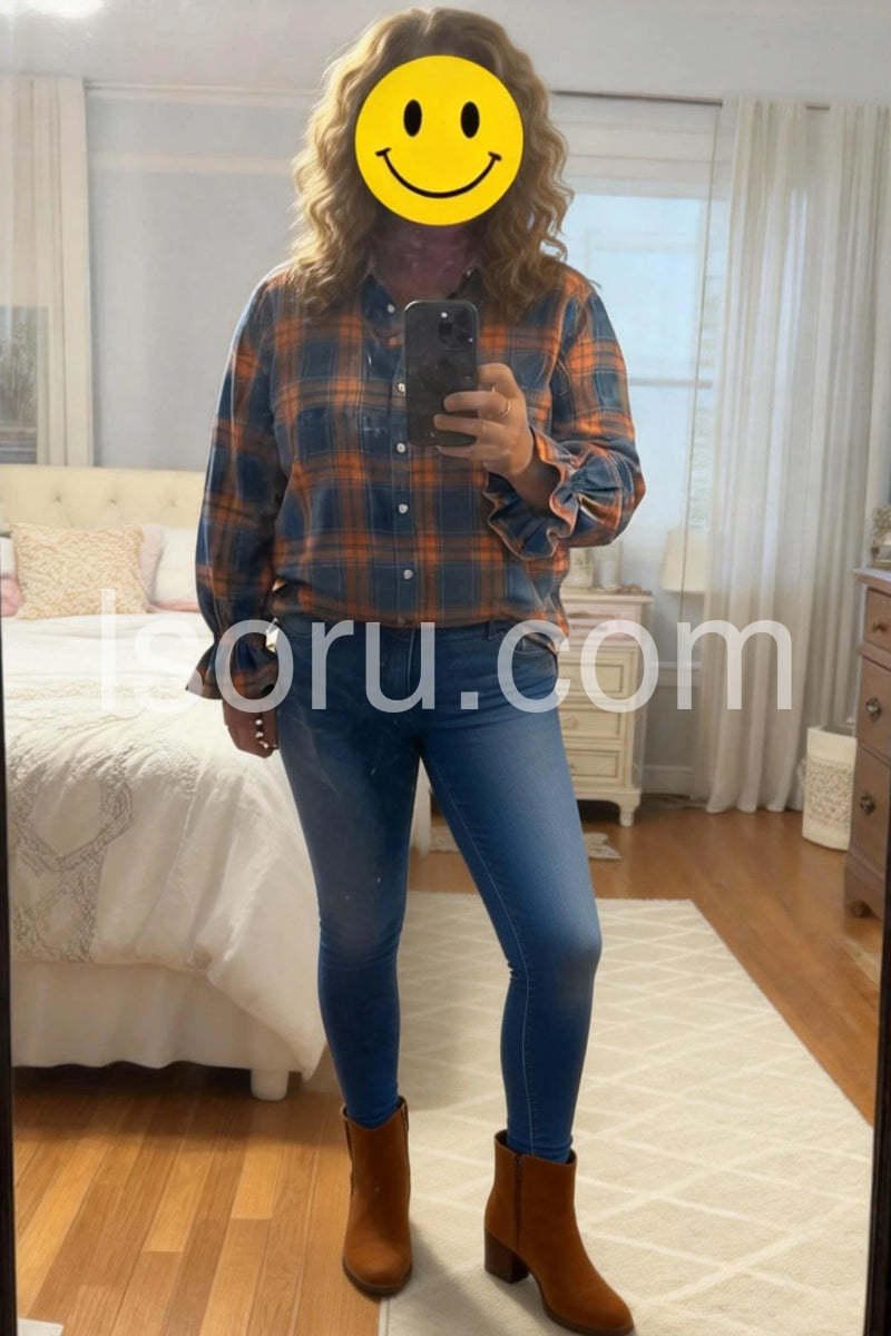 Absolutely love the ruffled sleeves! It takes a standard plaid shirt and makes it so much more feminine and fun. Fits true to size.
