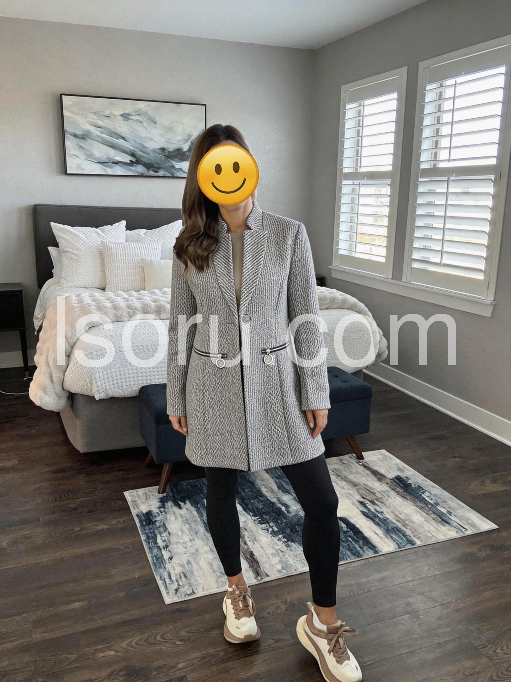 The textured grey knit is stunning in person. It has a slight tweed look to it that makes it perfect for autumn and winter. The zipper accents are a stylish addition. Truly a great buy for the season.