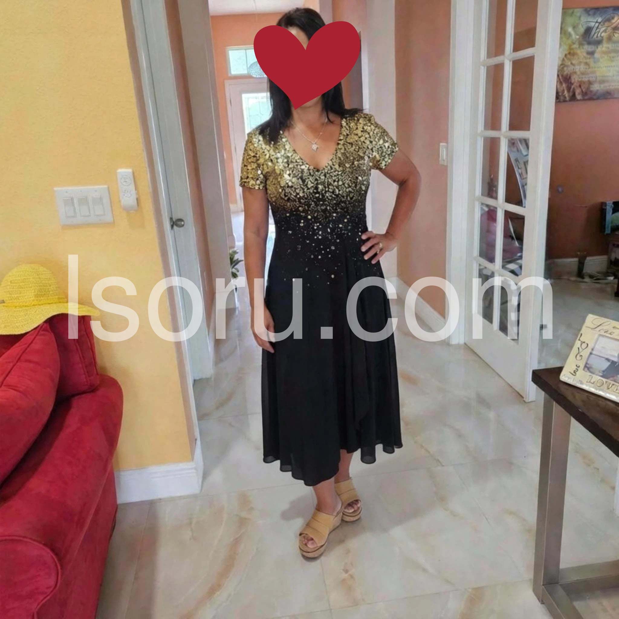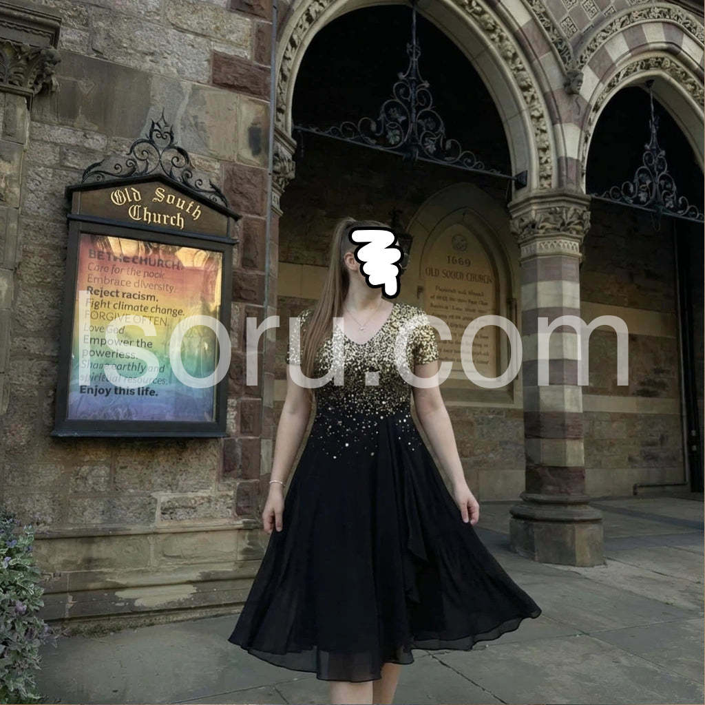 Beautiful dress for a holiday party! The sequins on the bodice catch the light perfectly without looking cheap. The skirt drapes beautifully and hides any tummy insecurities. I ordered my usual size and it fit like a glove. Will definitely buy from this brand again.