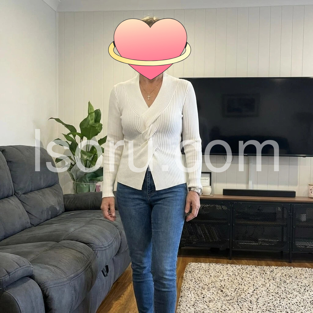 I absolutely love this sweater! The ribbed knit texture looks really nice, and the V-neck is very flattering. It’s lightweight but still warm, and it feels comfortable against the skin. The fit is flattering through the body and the sleeves sit well. I wore it on a beach day and it was perfect for the breeze. It matches the photos perfectly—great quality!