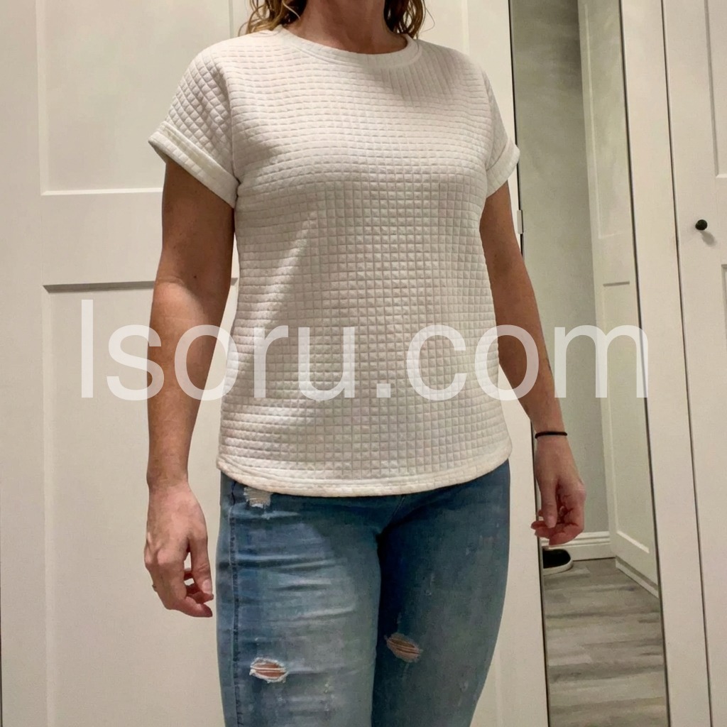 The rolled short sleeves are such a cute detail. It gives the top a structured but casual vibe. The crew neckline sits at exactly the right spot. Very happy with this purchase.