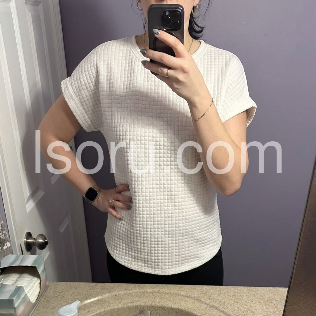 This is comfortable and I like the waffle fabric. It is soft to the touch. I like the dolman sleeves. I think this will be a nice spring/summer top. It feels well made and the fabric is not feeble. It feels long lasting. The neckline is a bit too high for me but I’m guessing not for most people. It has a casual appearance to it but could easily be dressed up a bit with a jacket or sweater.