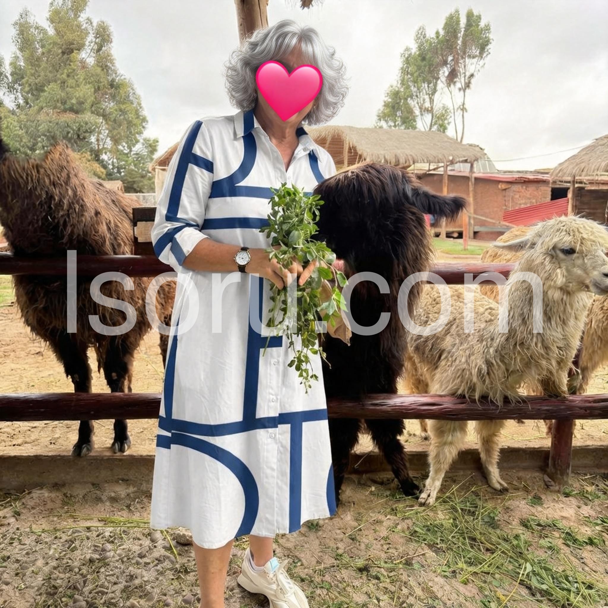 This is the most comfortable dress yet. The blue and white abstract lines on a collared, button-down design give it a creative flair. The material is breathable and lightweight, yet machine washable. It fits true to size, though you can size up to wear it as a stylish duster coat. The stitching is solid, and the dress has a beautiful flow. Whether for business or casual wear, this is ultimately a fantastic piece.